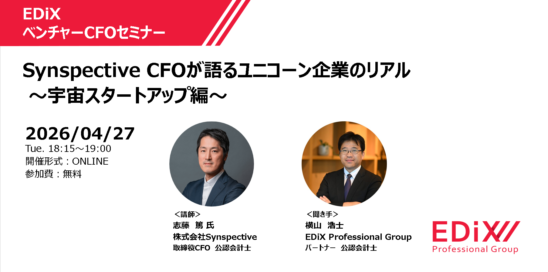 EDiXベンチャーCFOセミナー 「Synspective CFOが語るユニコーン企業のリアル ~宇宙スタートアップ編~」を4月27日(月)に開催します